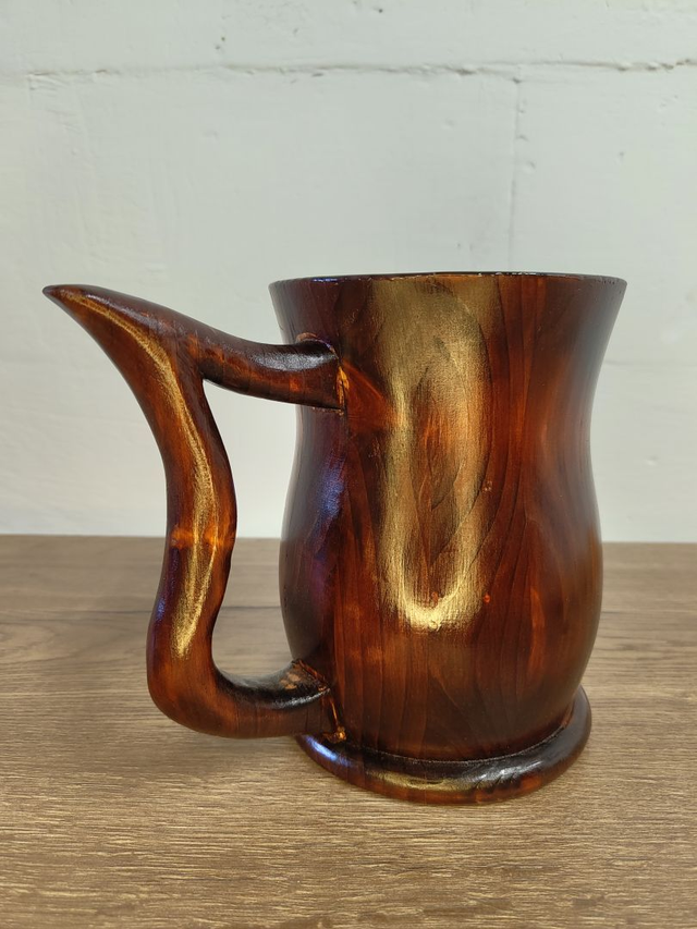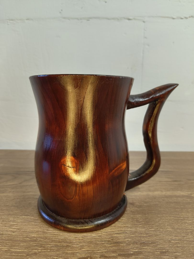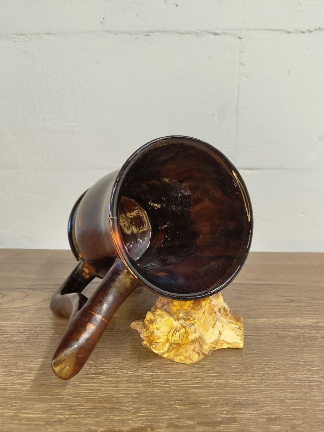 Gefertigt aus massivem Holz und sorgfältig von Hand gedrechselt, beeindruckt der Krug durch seine tief dunkelbraune Färbung und die lebendige, goldschimmernde Maserung. Der massive Henkel liegt sicher in der Hand und macht das Trinken auch bei vollem Krug angenehm und stabil.