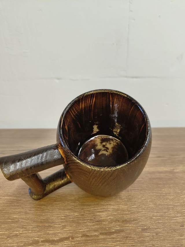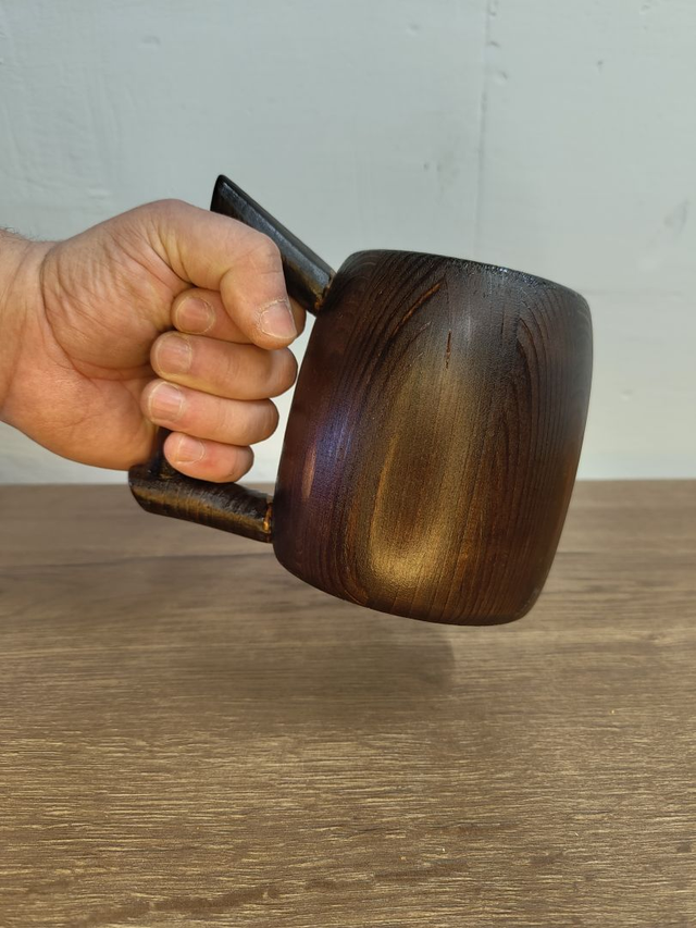 Aus massivem Holz von Hand gedrechselt, zeigt dieser Humpen eine tiefe, dunkle Farbgebung mit lebendiger Maserung und warmen Lichtreflexen.