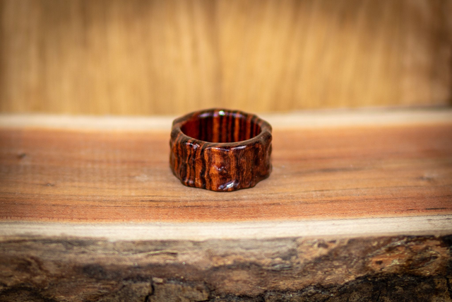 Der Holzring beeindruckt durch seine markante, unregelmäßige Oberfläche, die an die Struktur von Baumrinde erinnert. Die dunklen, warmen Brauntöne und die lebendige Maserung verleihen dem Ring eine kraftvolle, ursprüngliche Ausstrahlung. Jeder Ring ist ein echtes Unikat, geformt von Natur und Handwerk.