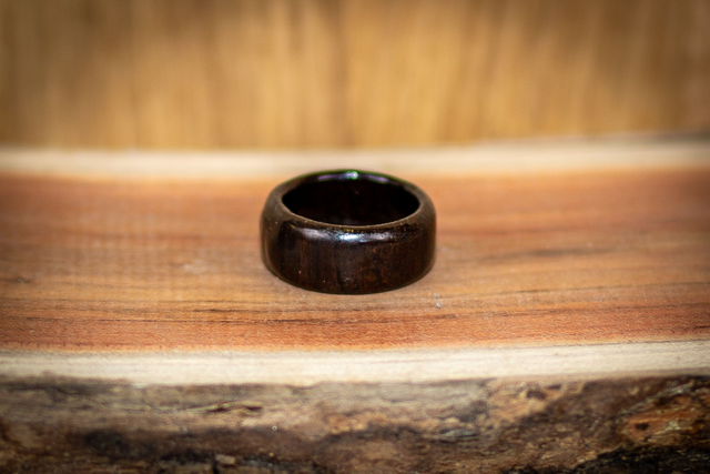 Die dunkle Holzmaserung verleiht dem Ring eine ruhige, fast mystische Ausstrahlung. Durch sorgfältiges Schleifen und Polieren entsteht eine angenehm glatte Oberfläche mit hohem Tragekomfort. Die leicht abgerundeten Kanten sorgen dafür, dass sich der Ring weich und natürlich am Finger anfühlt. Jeder Ring ist ein Unikat, geprägt durch die individuelle Struktur des Holzes.