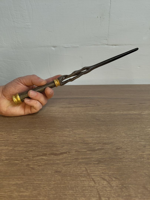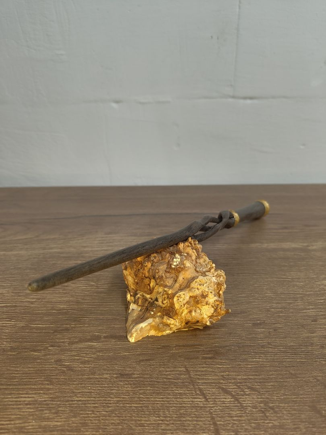 Seine Form erinnert an verwachsene Wurzeln uralter Wälder – als hätte die Natur beschlossen, einen Fokus magischer Energie zu erschaffen. Feine Akzente aus echtem Blattgold fassen das dunkle Holz ein und symbolisieren Wissen, Macht und die Verbindung zwischen den Welten. Die Oberfläche ist mit einem schützenden Wasserlack veredelt der die natürliche Struktur bewahrt.
