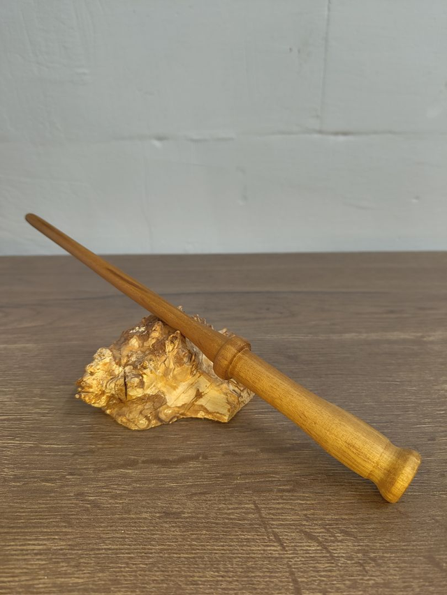 Sein schlichter, ausgewogener Aufbau erinnert an die klassischen Stäbe aus den Hallen alter Zauberschulen. Der sanft geformte Griff liegt sicher in der Hand und vermittelt Kontrolle und Vertrauen.