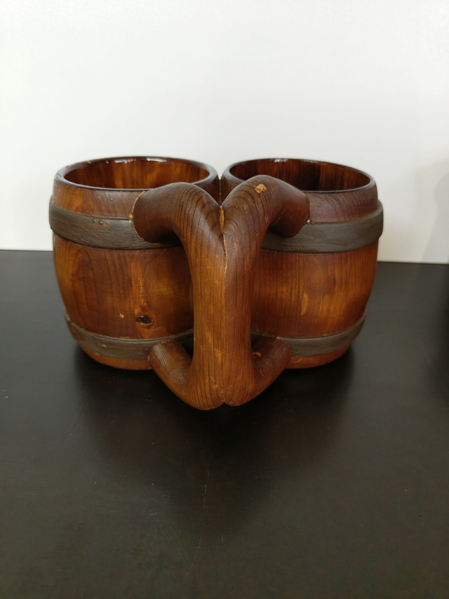 Der Holz-Doppelbecher Zwillingsfass steht für Gemeinschaft, Geselligkeit und echtes Handwerk. Zwei massiv gearbeitete Holzbecher sind fest miteinander verbunden und erinnern in ihrer Form an klassische kleine Holzfässer.